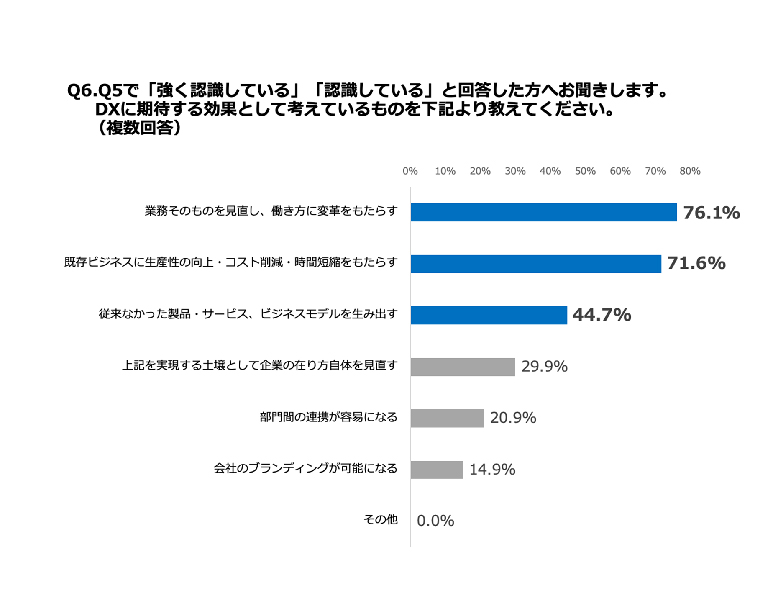 また、DXを経営課題として「強く認識している(34.7%)」「認識している(54.7%)」と回答した人を対象とした「 DXに期待する効果として考えているものを下記より教えてください(複数回答)」という設問では、「業務そのものを見直し、働き方に変革をもたらす」が76.1%、「既存ビジネスに生産性の向上・コスト削減・時間短縮をもたらす」が71.6%がトップ2。3位の「従来なかった製品・サービス、ビジネスモデルを生み出す」は44.7%と半数以下だ。