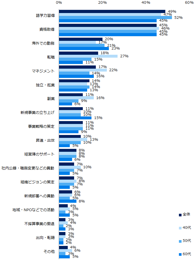 やらずに後悔していることがあると回答された方に「それはどんな経験ですか?」と伺うと、最も多かったのは「語学力習得」(49%)、次いで「資格取得」(45%)が続く。年代別では、ポイントの開きが最も大きいのは「転職」だった(40代:27%、50代:15%、60代:11%)。
