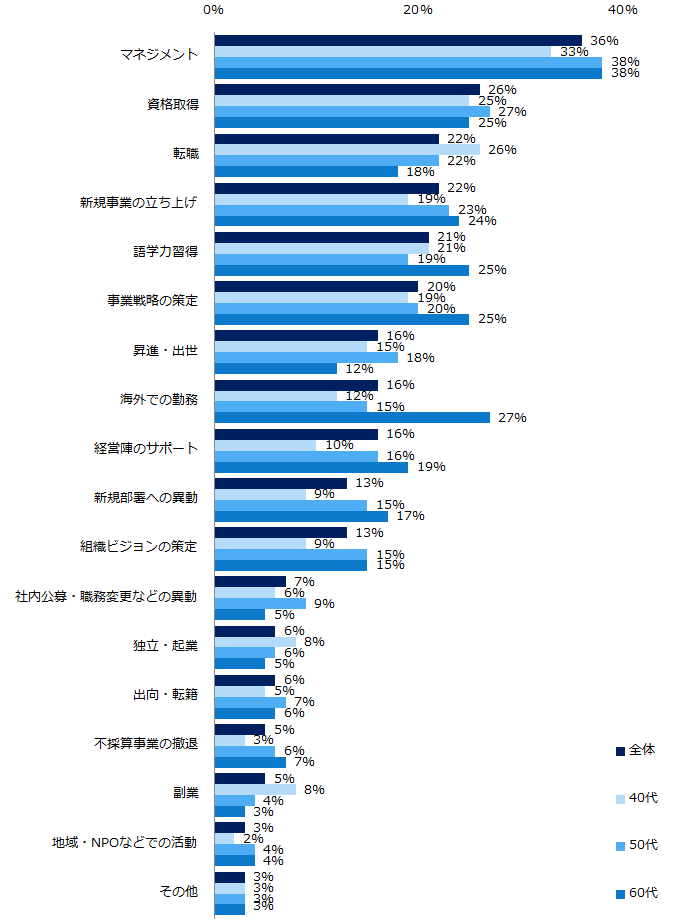 さらに、「それはどんな経験ですか?」と伺うと、トップ3は「マネジメント」(36%)、「資格取得」(26%)、「転職」(22%)だった。「海外での勤務」では年代による回答の差が顕著で、40代と比較して60代は11ポイント高い結果になった。